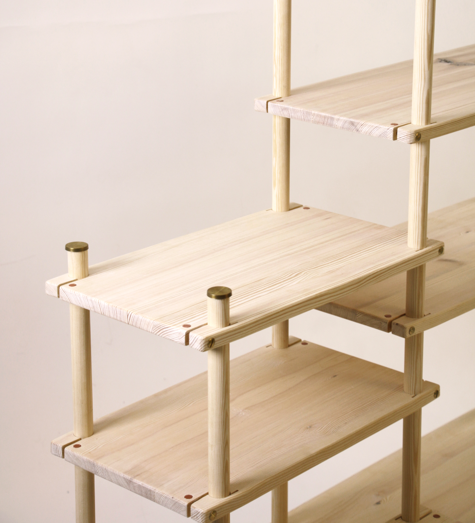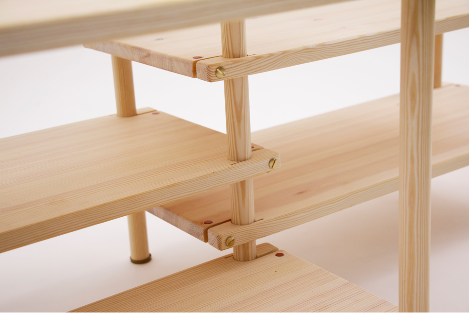 SPRÅNG skapades utifrån en låskonstruktion som består av tre grundläggande komponenter: mutterhylsa, pinnskruv och sargsprint. Att integrera dessa element skapas en robust och samtidigt flexibel mekanism för att fästa hyllplanen. Genom att enkelt skruva på mutterhylsan kan användaren justera och säkra hyllplanen på plats runt en central rundstav. Denna mekanism möjliggör inte bara en säker och stabil placering av objekt på hyllorna, utan också en enkel och lekfull omarrangering av hyllorna i olika formationer och mönster.