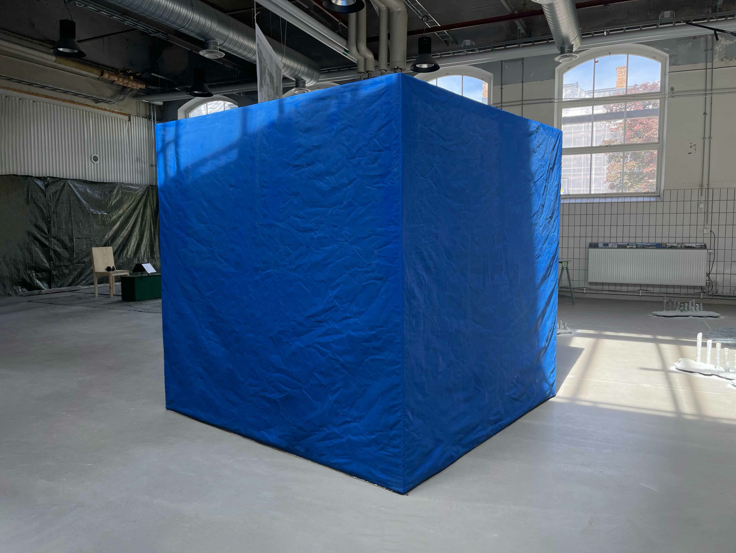 ”Lament of Warfare” manifests as an installation, taking the form of a 2 x 2-meter cube enveloped in a custom-made color coined Dictatorship Blue. Situated at the center of a large room, the cube is intentionally designed to be cryptic, prompting the public to discern the entry mechanism and subsequently explore its interior. The installation aims to create a sense of discomfort in viewers, enabling them to empathize with the experiences depicted.