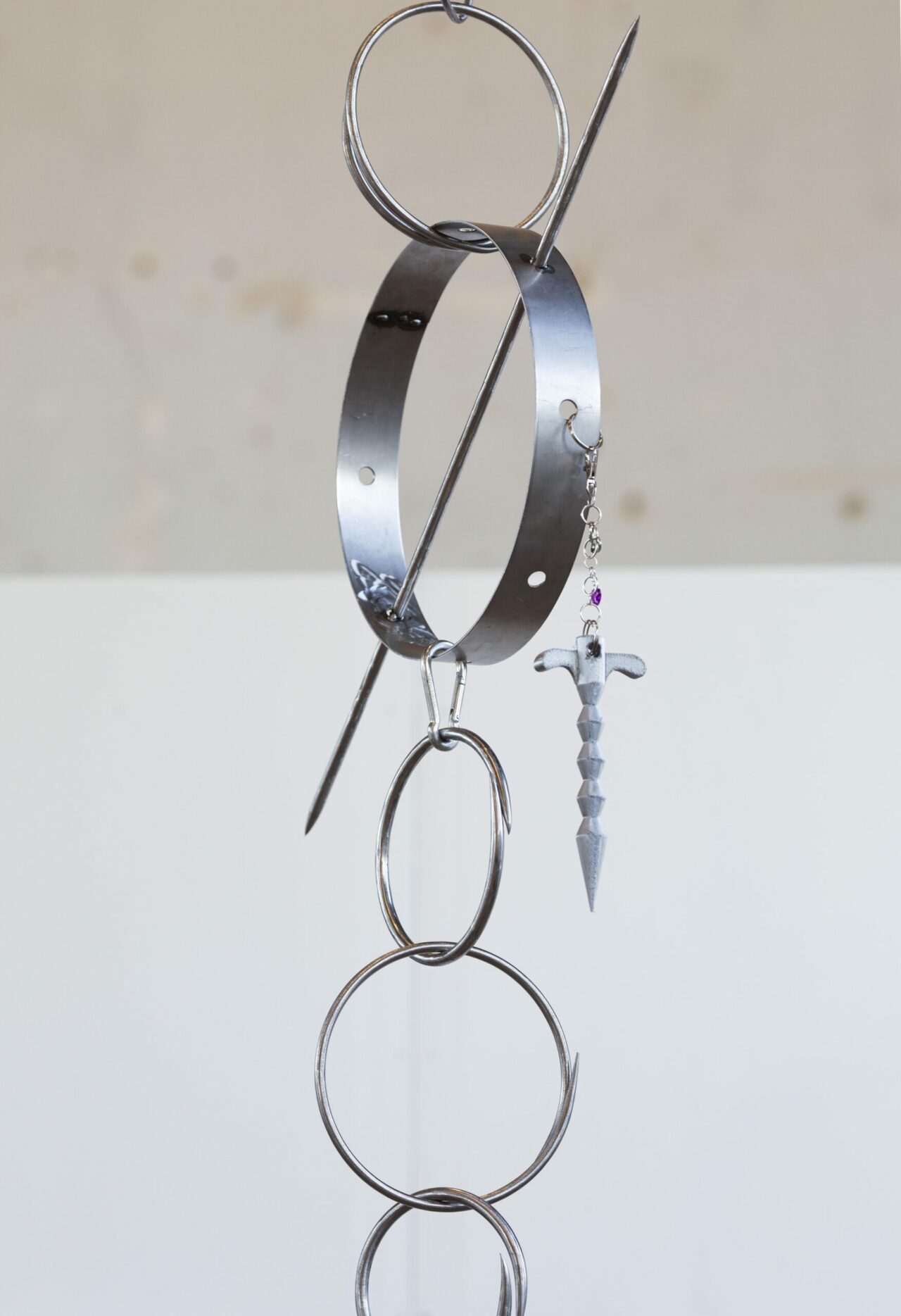 Valsad, slipad och svetsad aluminium, 3D-printade objekt, personliga föremål, skuret akrylglas, berlocker, pärlor. 350 cm i höjd.