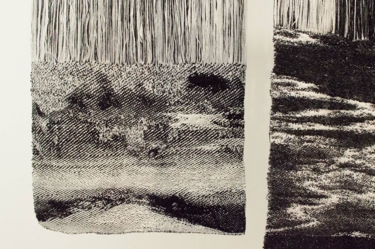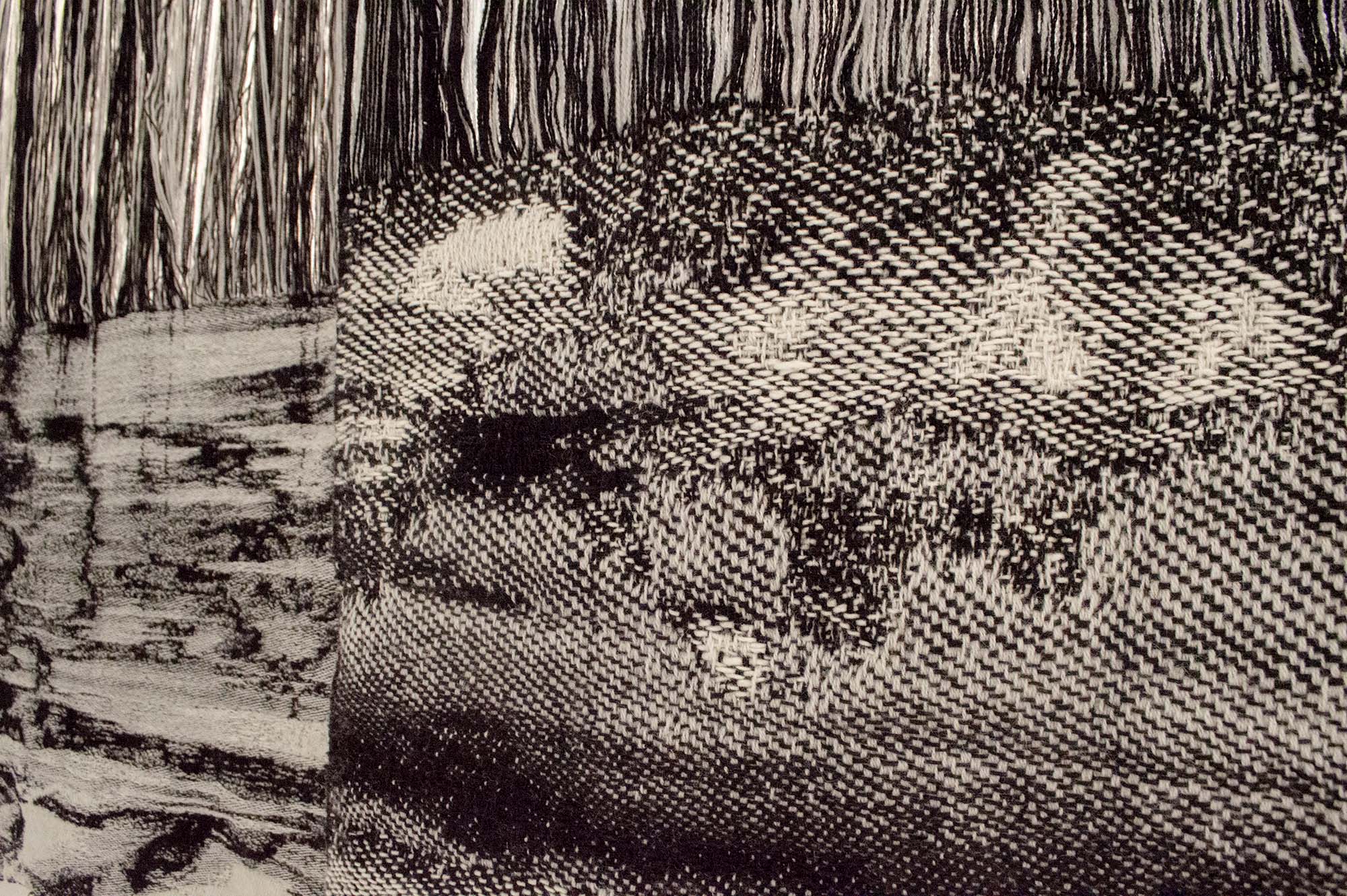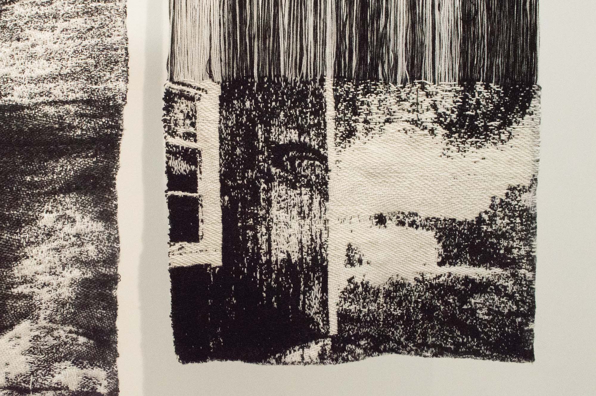 Motiv från min hembygd blandas med andra vyer norrifrån och skapar diffusa, svartvita kollage. De vävs fram i grövre ull för att bilda en varm, tung, skyddande och kompakt yta. Jag har undersökt hur en tvåfärgad varp, tillsammans med dubbelvävsbindningar kan skapa helt svarta och vita fält samt gråskalan som sker däremellan. En gråskala som gör att motivet löses upp på nära håll och klarnar på längre avstånd. På nära håll ser du bindningarna och materialet. På avstånd kan du skymta björkar vid en sjö, blåa berg som letar sig ner i blåa hav eller en inlandsväg under en snöstorm. Alla dessa platser löses upp och blandas till nya landskap, eller kanske rättare minnena av dem.