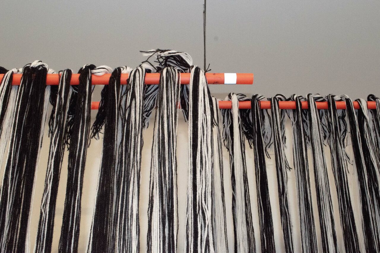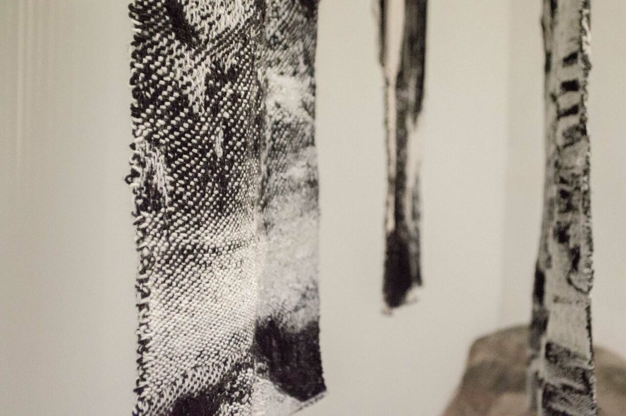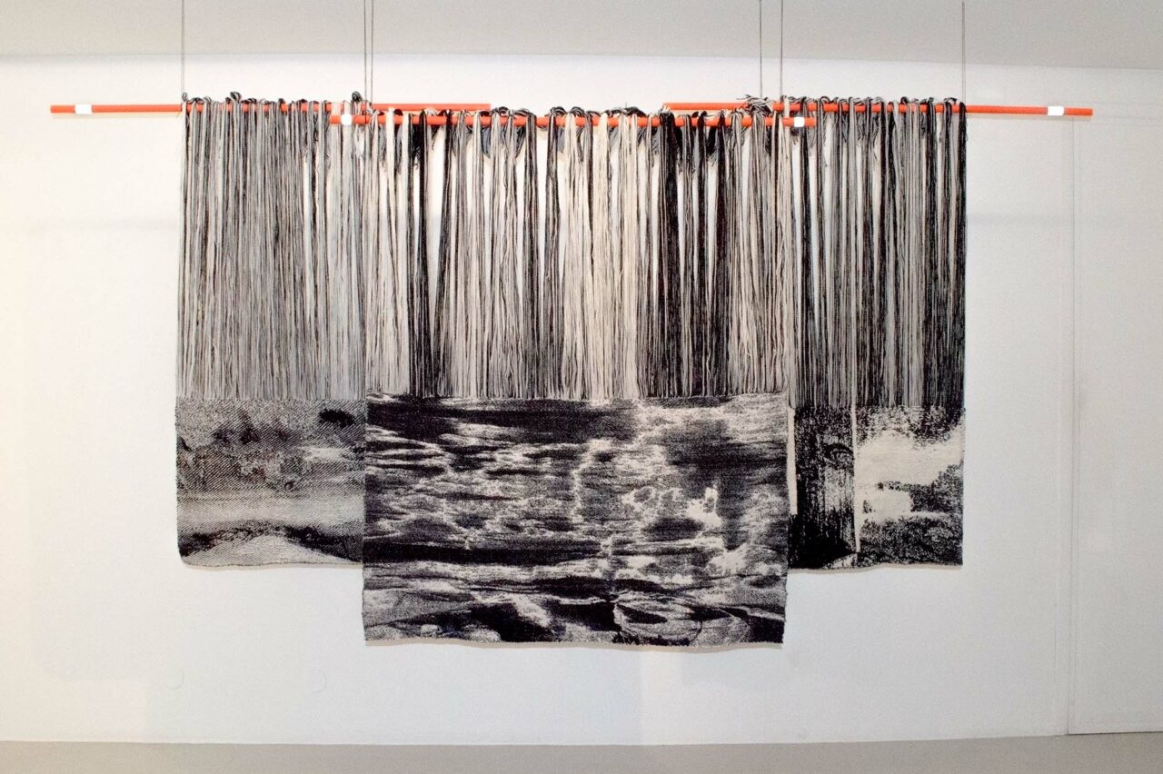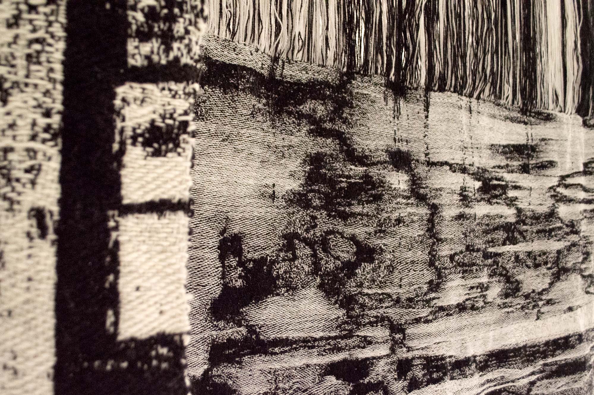Motiv från min hembygd blandas med andra vyer norrifrån och skapar diffusa, svartvita kollage. De vävs fram i grövre ull för att bilda en varm, tung, skyddande och kompakt yta. Jag har undersökt hur en tvåfärgad varp, tillsammans med dubbelvävsbindningar kan skapa helt svarta och vita fält samt gråskalan som sker däremellan. En gråskala som gör att motivet löses upp på nära håll och klarnar på längre avstånd. På nära håll ser du bindningarna och materialet. På avstånd kan du skymta björkar vid en sjö, blåa berg som letar sig ner i blåa hav eller en inlandsväg under en snöstorm. Alla dessa platser löses upp och blandas till nya landskap, eller kanske rättare minnena av dem.