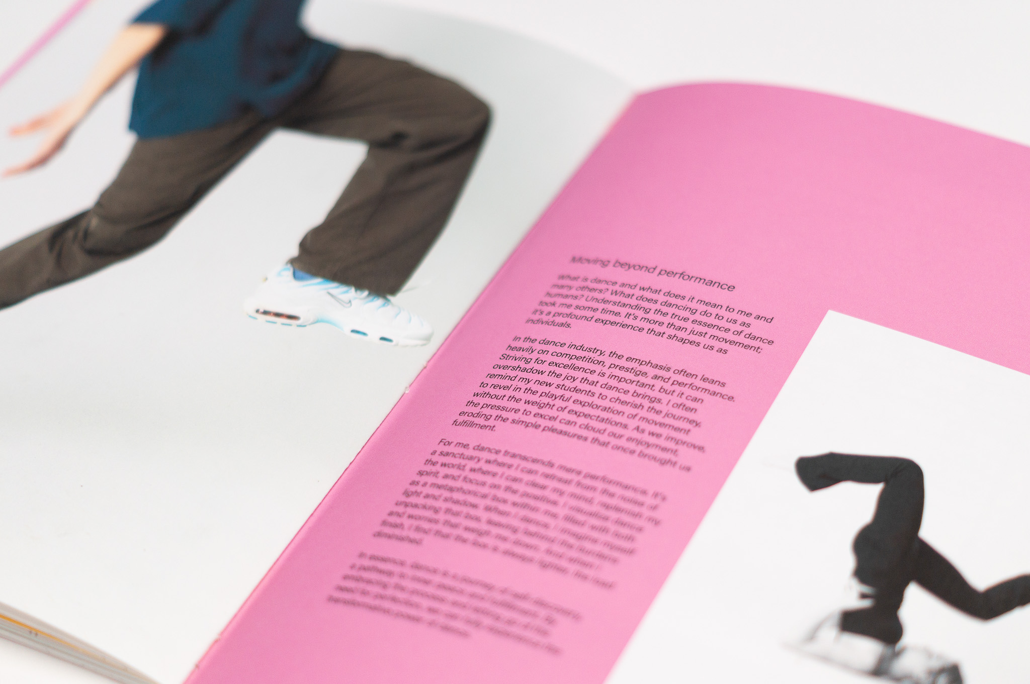 The one where she started to dance är en coffee-table-målarbok som vill bjuda in läsare att interagera med den. Boken kombinerar berättelser, illustrationer och fotografier för att bjuda in läsarna att uppleva dansens glädje genom en visuell resa från en färglös tillvaro till ett liv fyllt av färg. Den är designad för att inspirera människor att ta det första steget mot att dansa och upptäcka dess hälsofördelar.