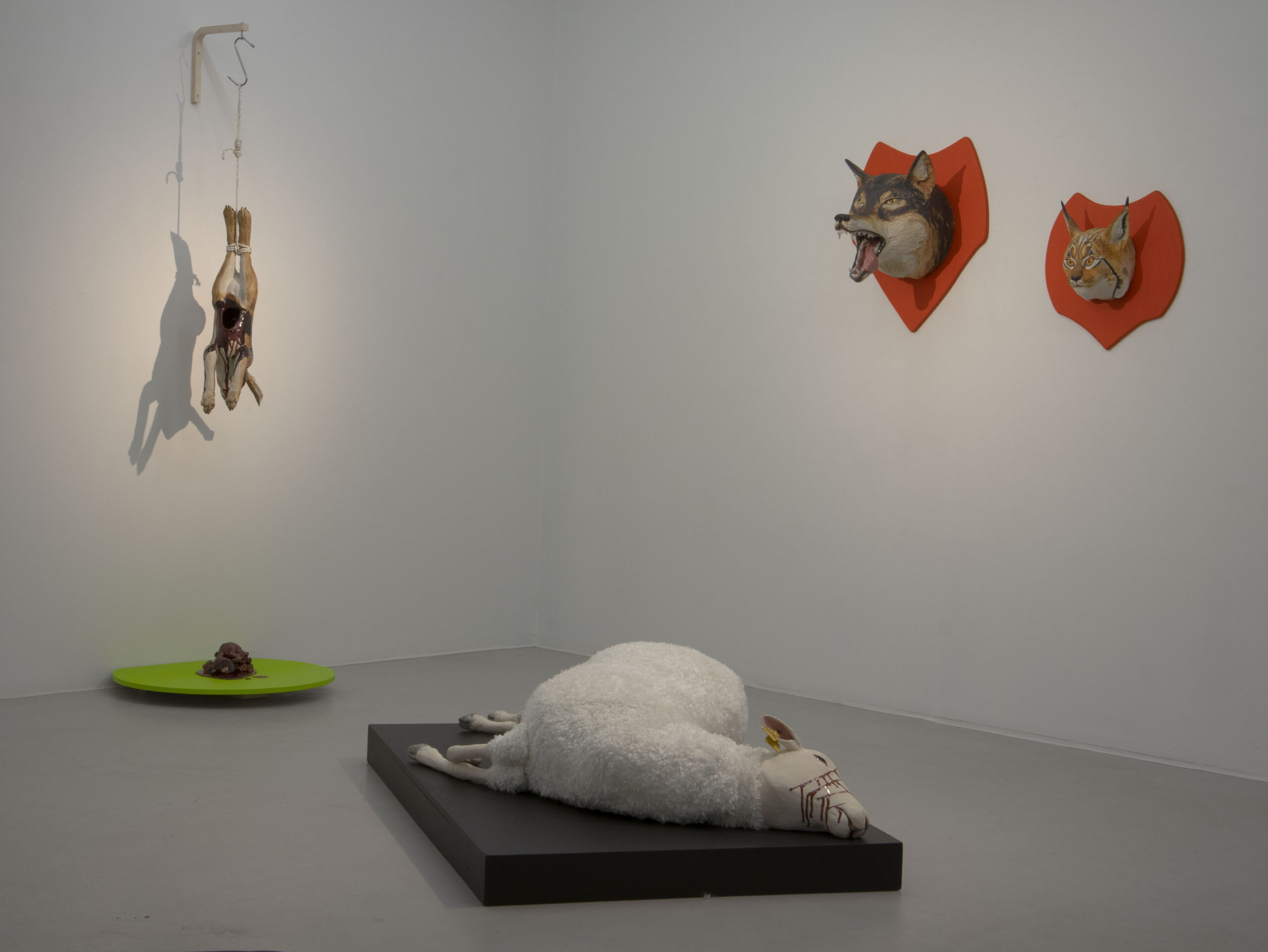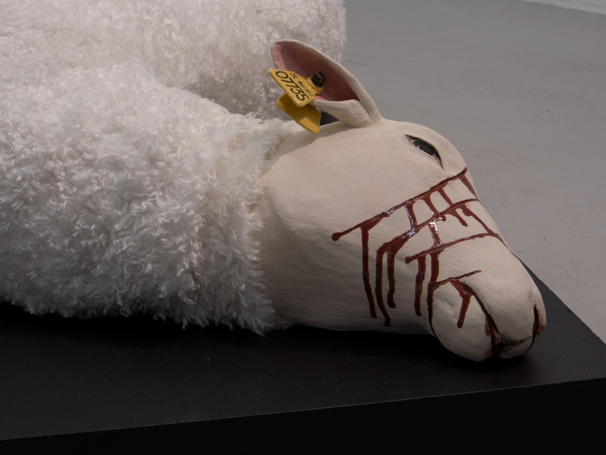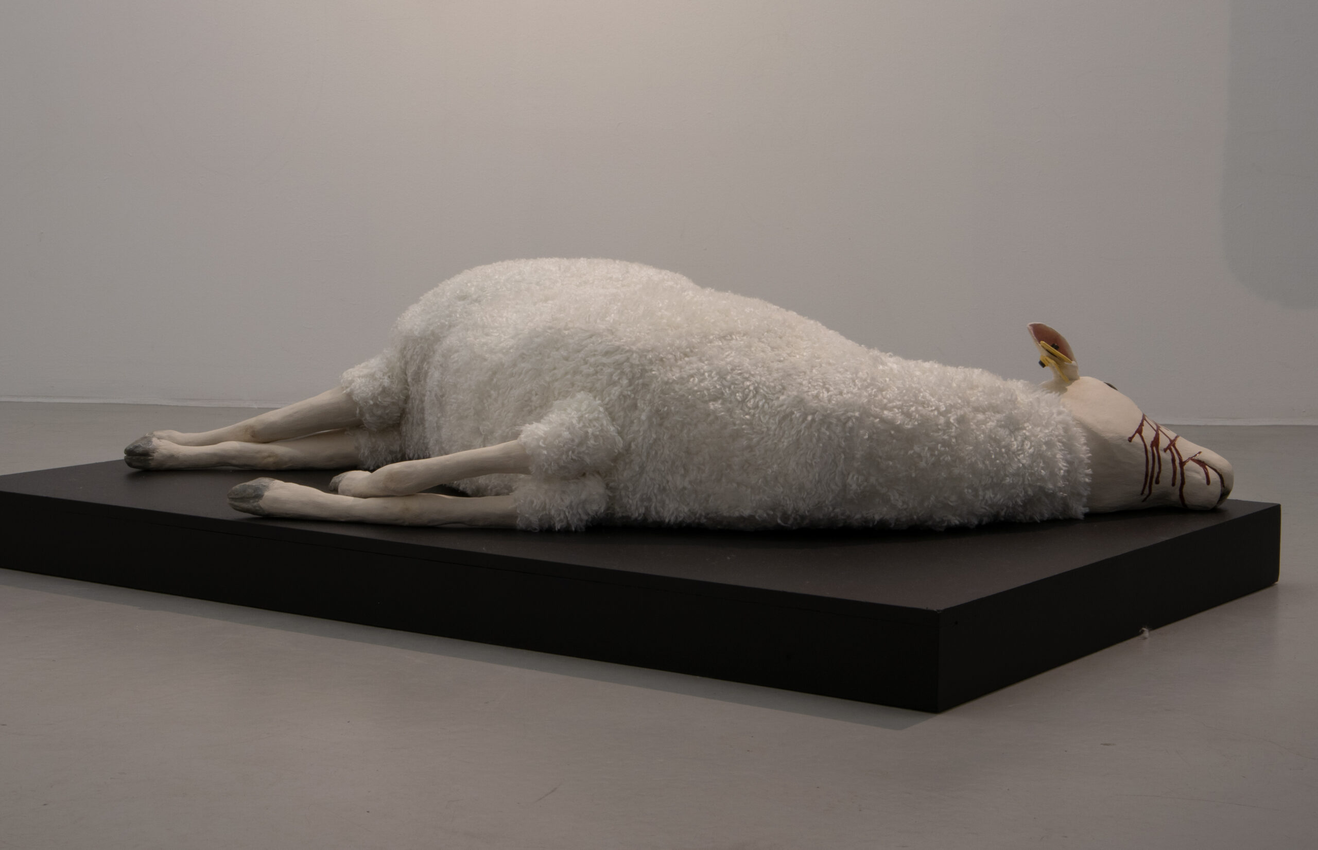 Ett får sticker ut som boskapsart och med mötet utav en mjuk textilkropp bryter den keramikens hårda och stumma uttryck. Hon ligger stilla på golvet klöst i ansiktet. Blodet återkommer och rinner över den vita grunden.