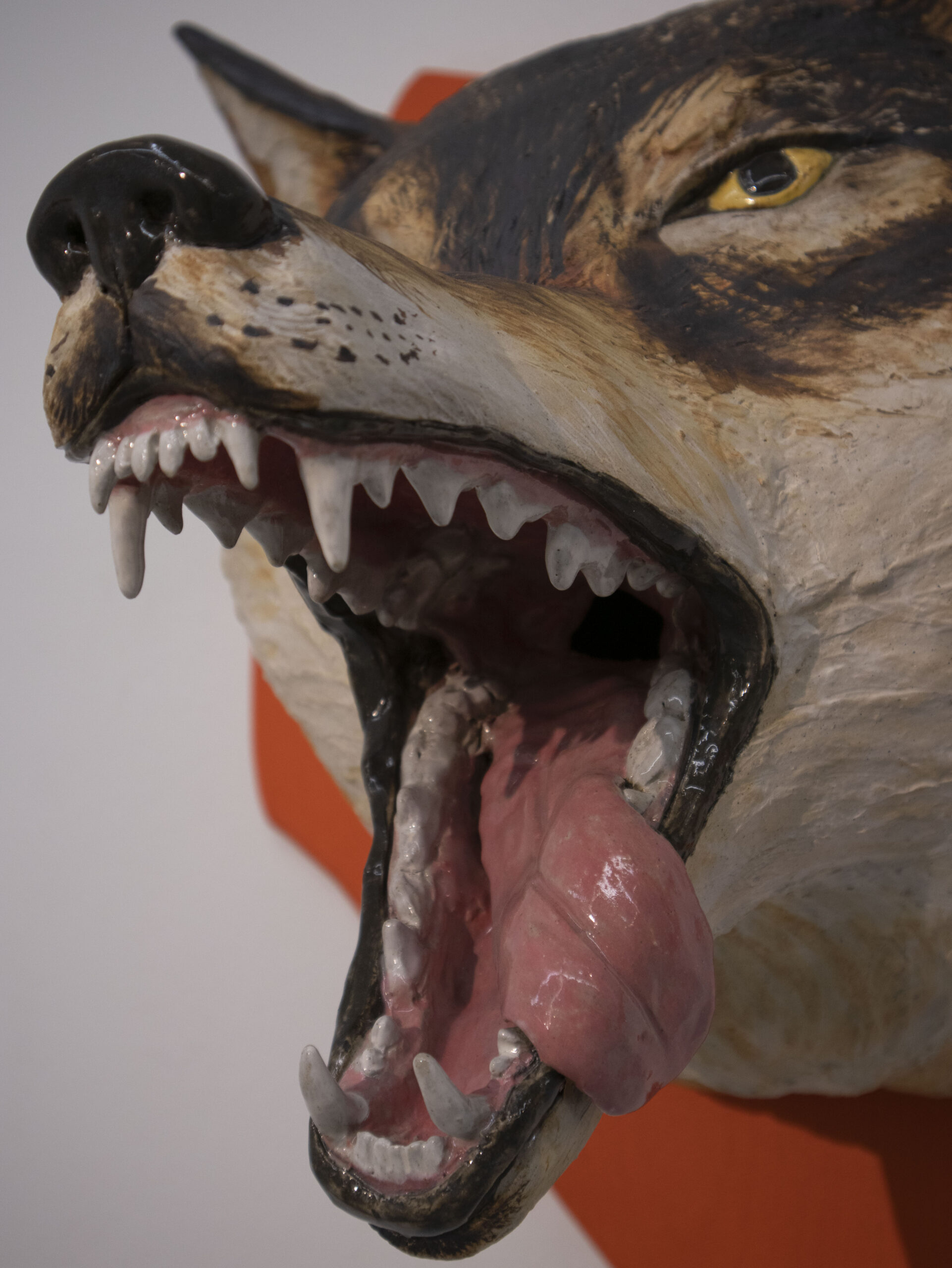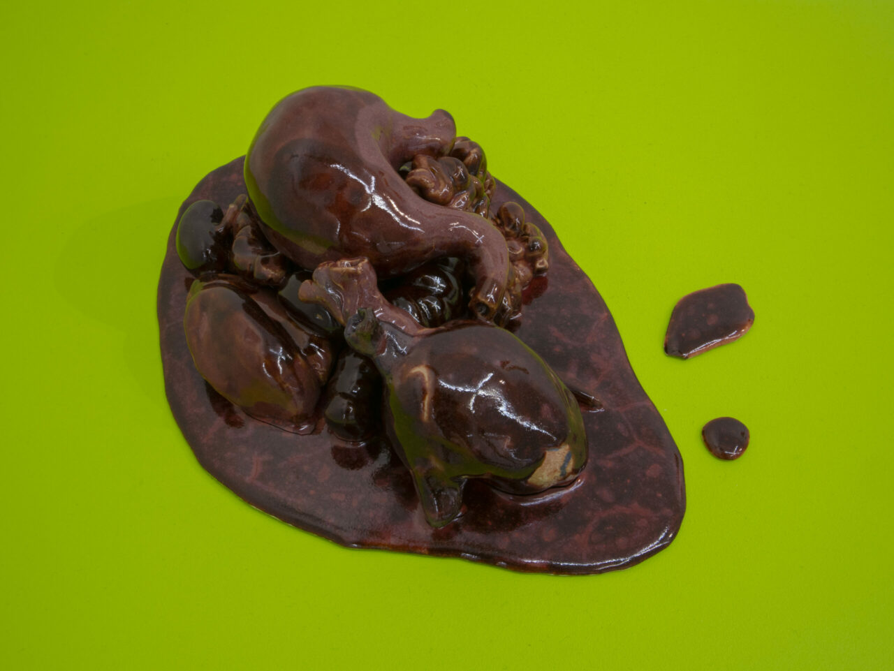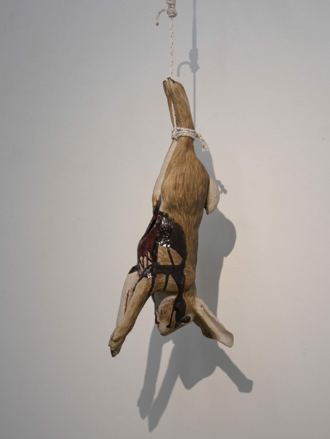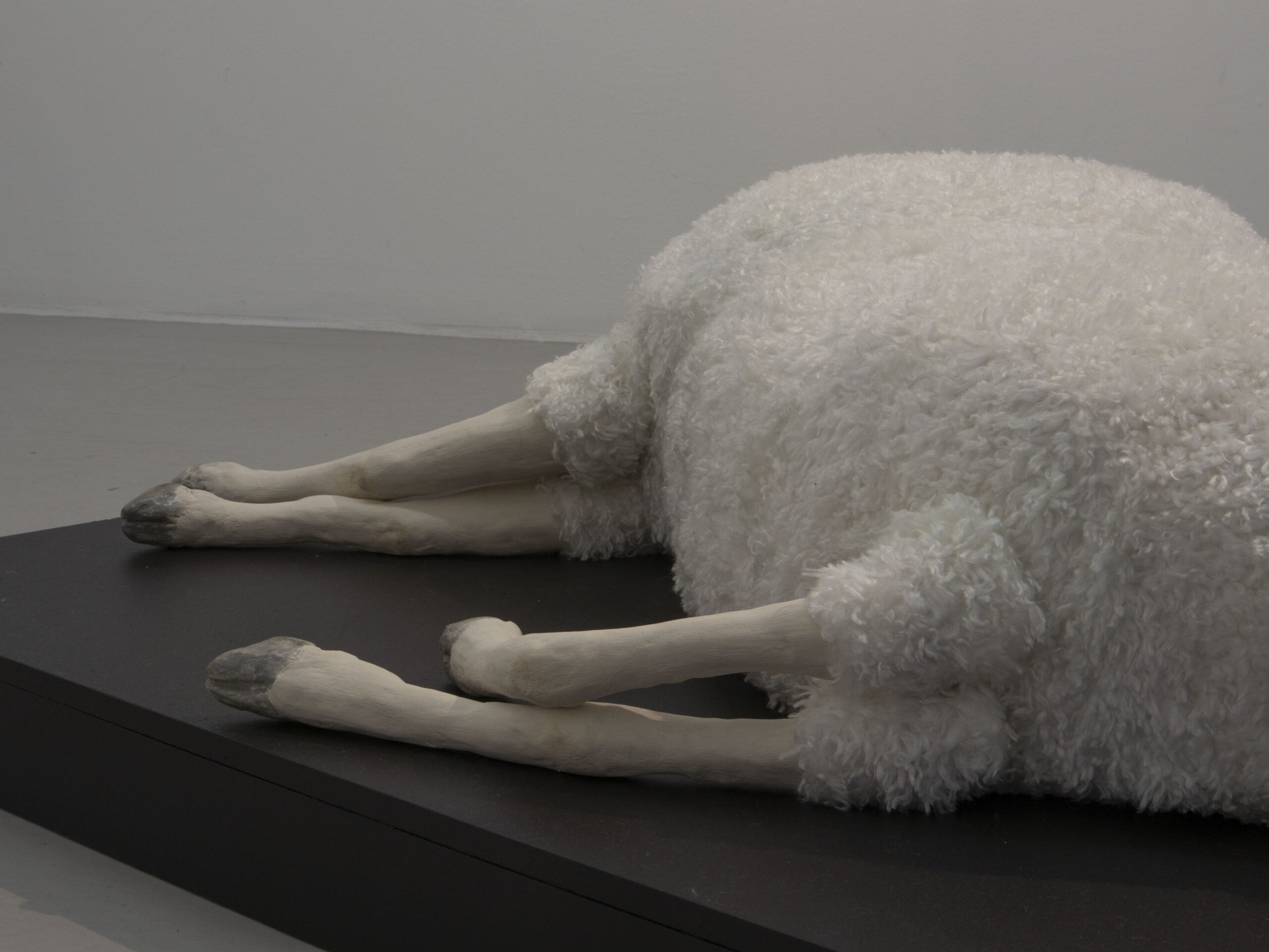 Ett får sticker ut som boskapsart och med mötet utav en mjuk textilkropp bryter den keramikens hårda och stumma uttryck. Hon ligger stilla på golvet klöst i ansiktet. Blodet återkommer och rinner över den vita grunden.