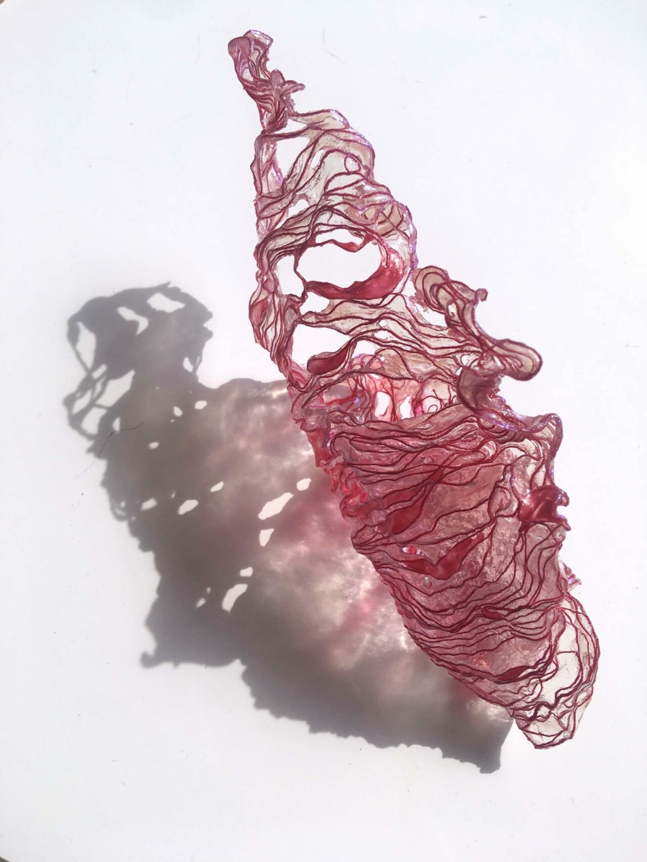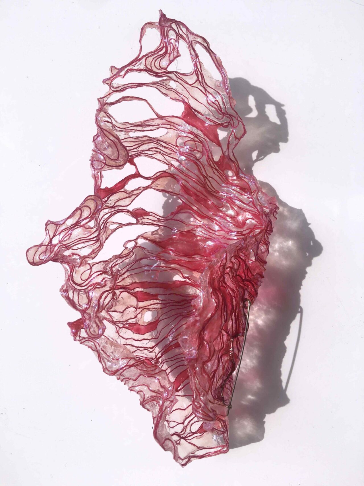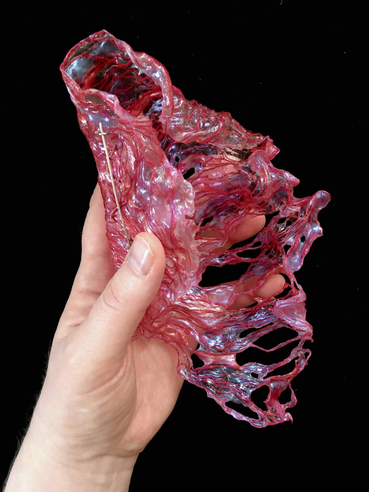 Jag har länge fantiserat om ett visuellt obestämbart material, ett material som hela tiden befinner sig i en slags optisk transformation mellan kropp och objekt, levande och dött, naturligt och artificiellt. Mina broscher växte fram ur de tankarna.