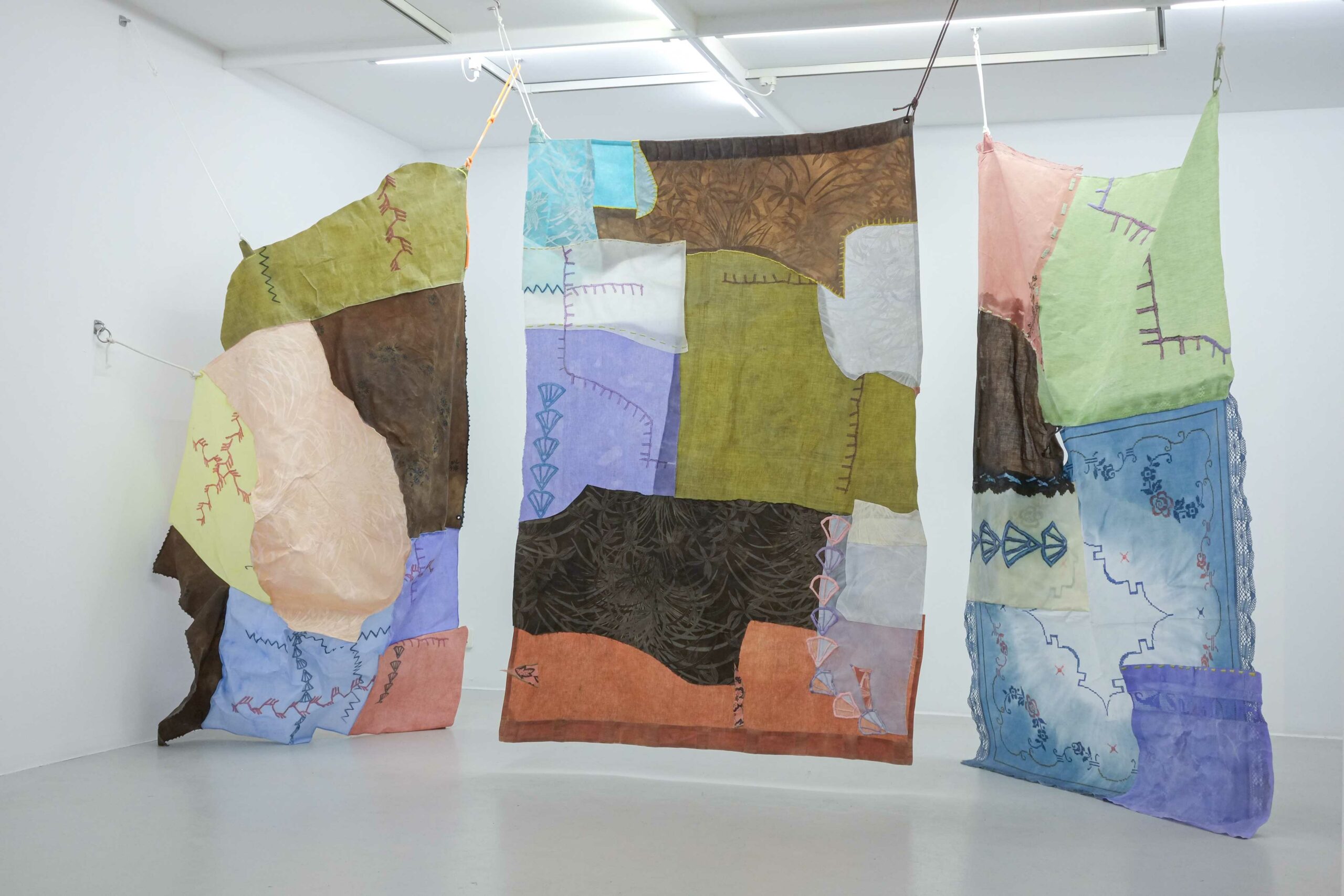 My project thrives on the multiplicity of narratives connected to domestic textiles and embroidery. It reflects upon feminine experiences, emotions and interconnectedness between the personal and the political. The inherent quality of textiles to fold acts as a metaphor for an ongoing movement between formation and undoing, concealing and revealing. Simultaneously, they act as palette in an expanded abstract painting, composed of stitches, overlapping color fields, and the structures created by beeswax.