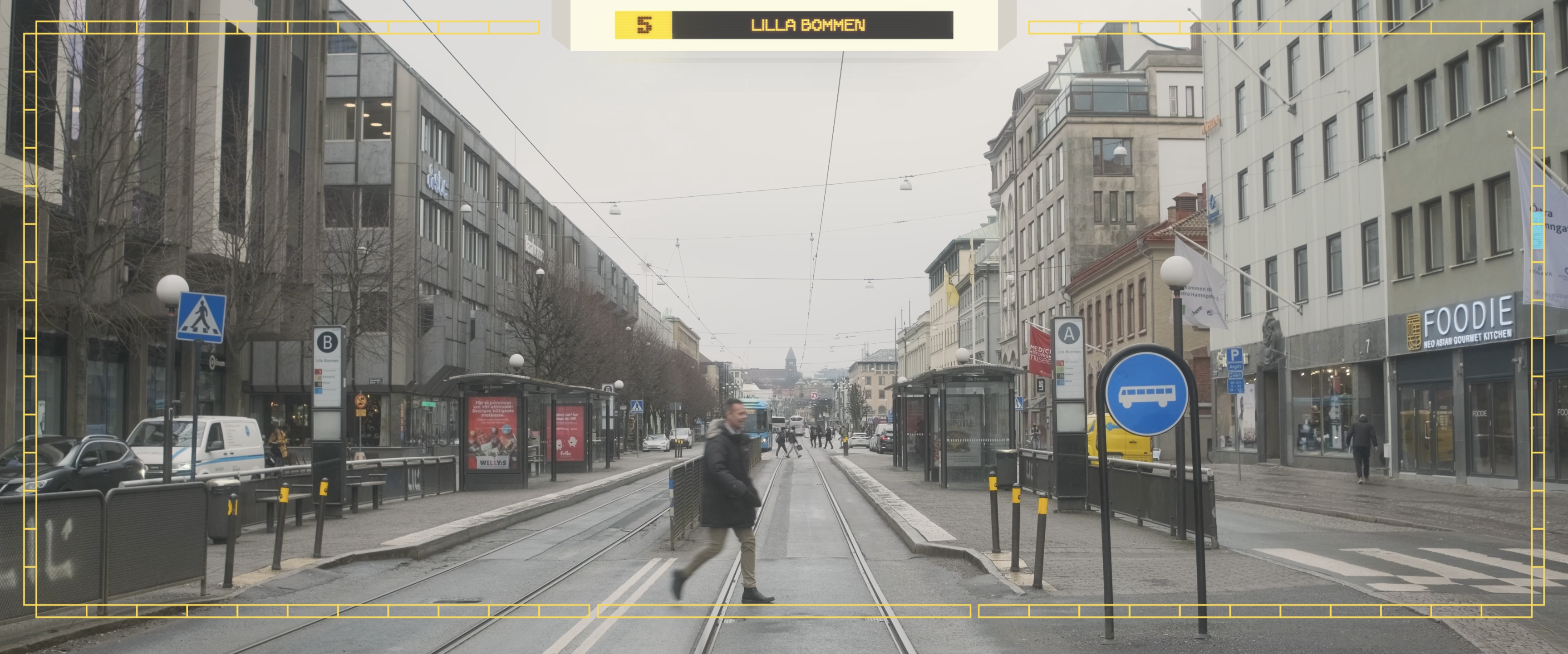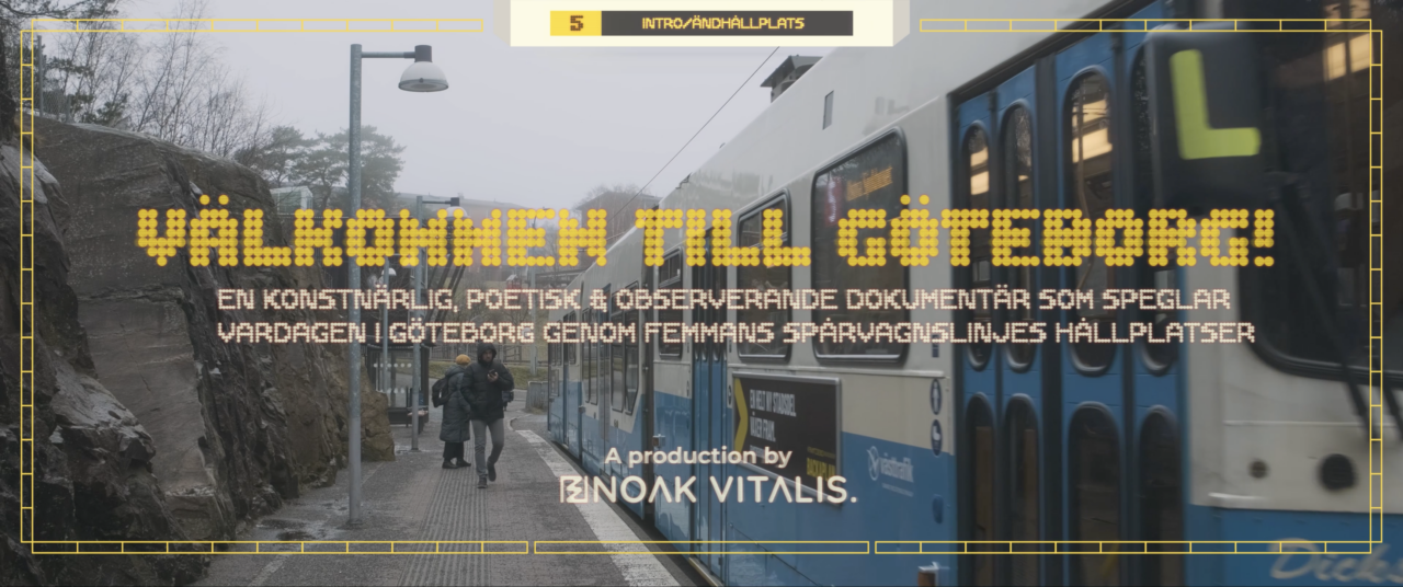 “Välkommen till Göteborg!” Or “Welcome to Gothenburg!” is a video documentation of the stops on tram line five, with the aim of reflecting and documenting everyday life in Gothenburg, as well as serving as a framework for a transdisciplinary exploratory design process. The final result is a 10-minute short film divided into five sections, created through a mix of a three-act structure, tram maps, and an EP/Album structure, where each part represents different segments of the tram journey.