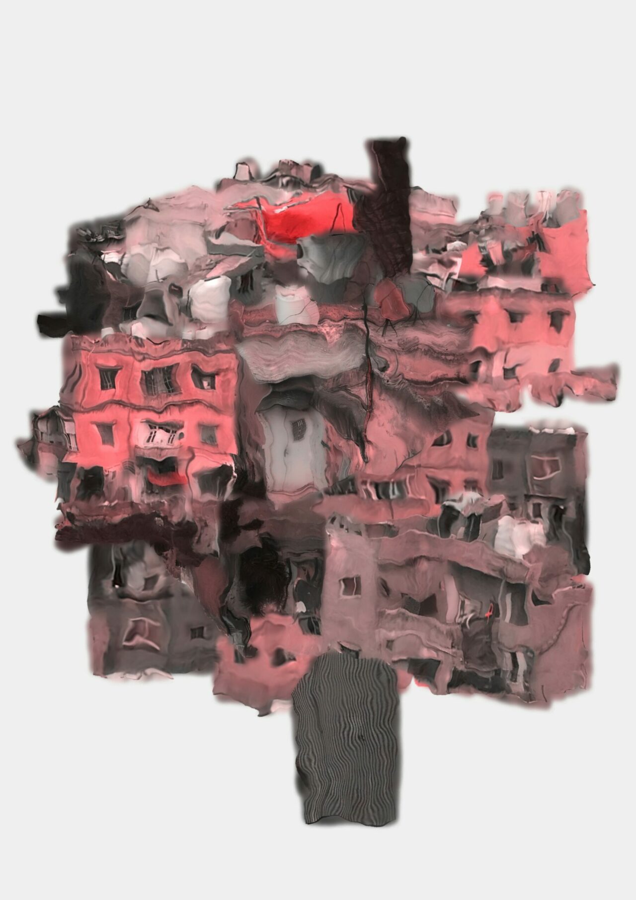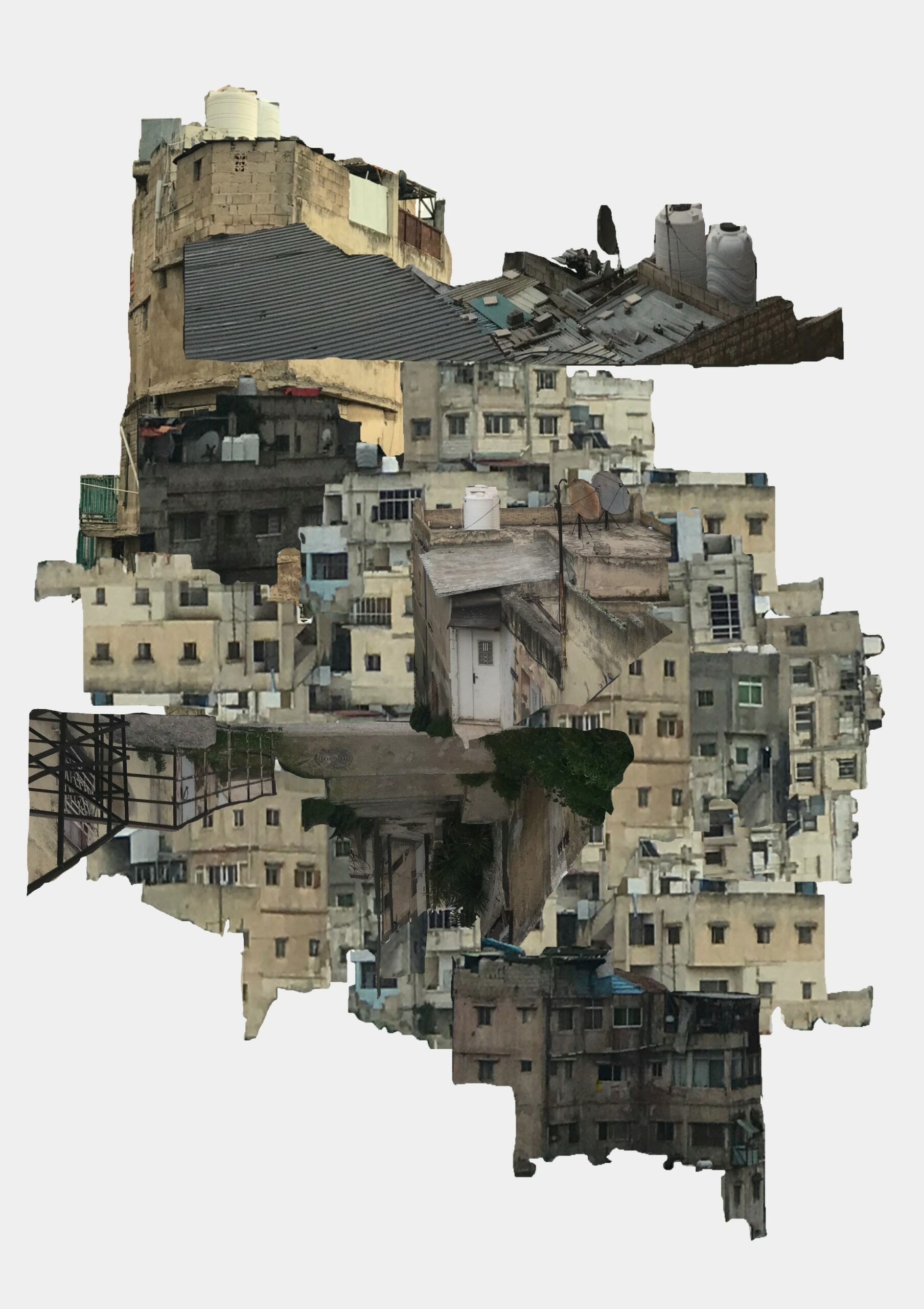 “Dancing Edifices” is a series of digital paintings that emerged in response to my research project Hidden Dimension, in which I am investigating how architecture affects women’s sensitivity to bodily motion experiences in marginalized and refugee areas, particularly in the Palestinian refugee camps in East Amman where I was raised. Through Dancing Edifices, I aim to evoke visually induced motion sickness through re-compositions of the spatial architecture of East Amman’s Palestinian refugee camps. This type of motion sickness can occur when there is visual stimulation in the absence of physical movement. This endeavor reimagines the camp’s architectural challenges, reshaping the physical space’s movement and organization and transcending the confines of mere bodily motion. These images open possibilities for questioning or imagining embodied experiences with the camp’s physical and social structure.