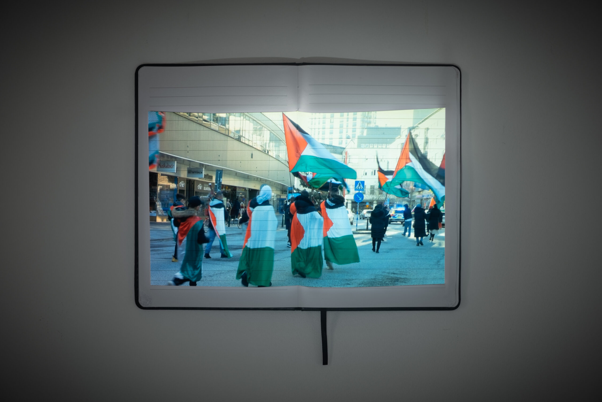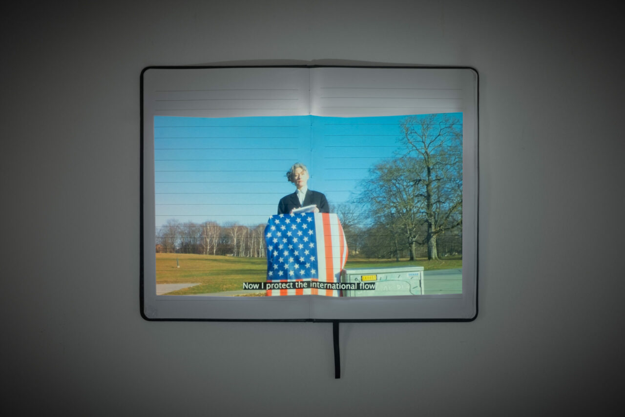 Detta collage av citat har blivit till låten Biden med en tillhörande musikvideo. Under examensutställningen FINE! projicerades videon på ett anteckningsblock som spikats fast på galleriväggen.