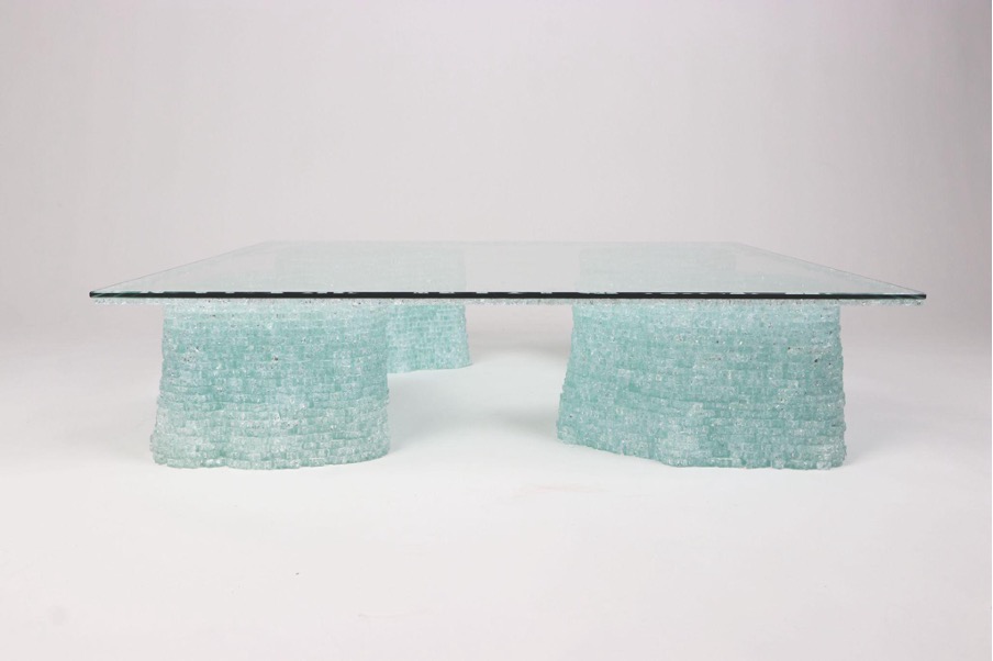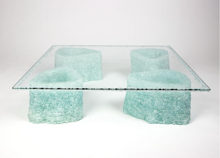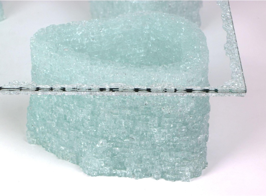 Skavank är ett loungebord som fokuserar på att omvandla trasigt glas till en estetisk tilltalande möbel genom upcycling.