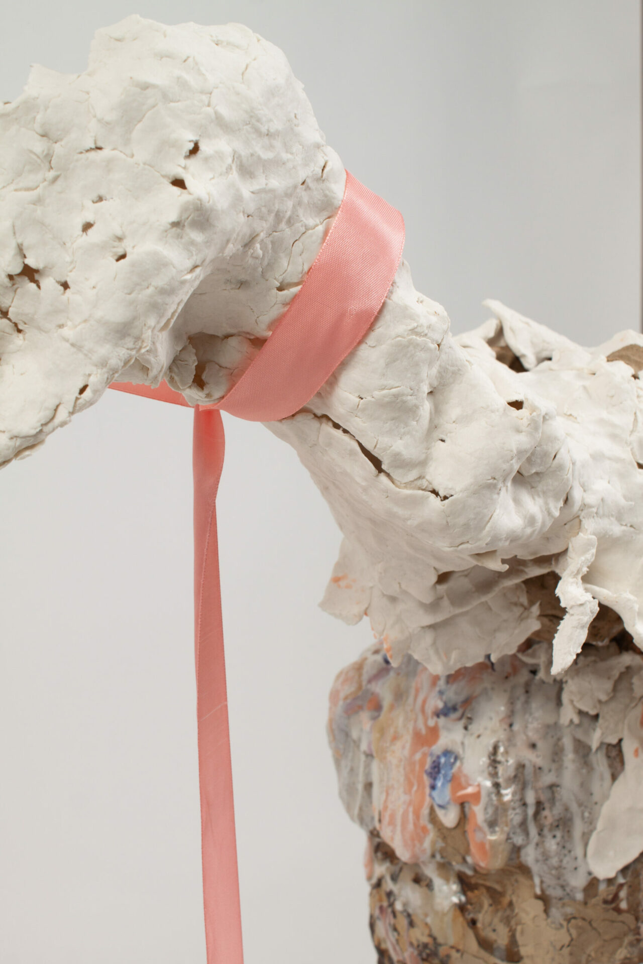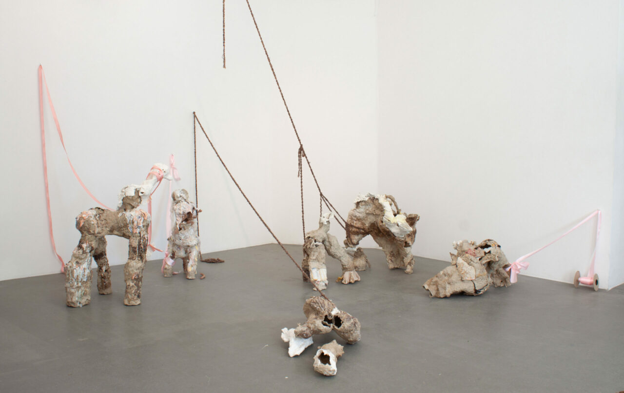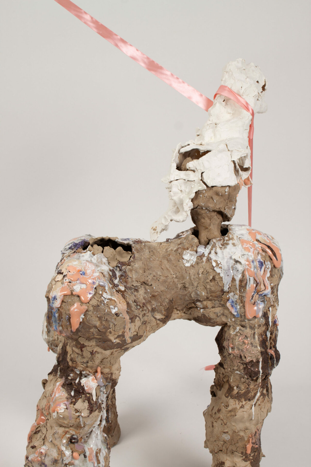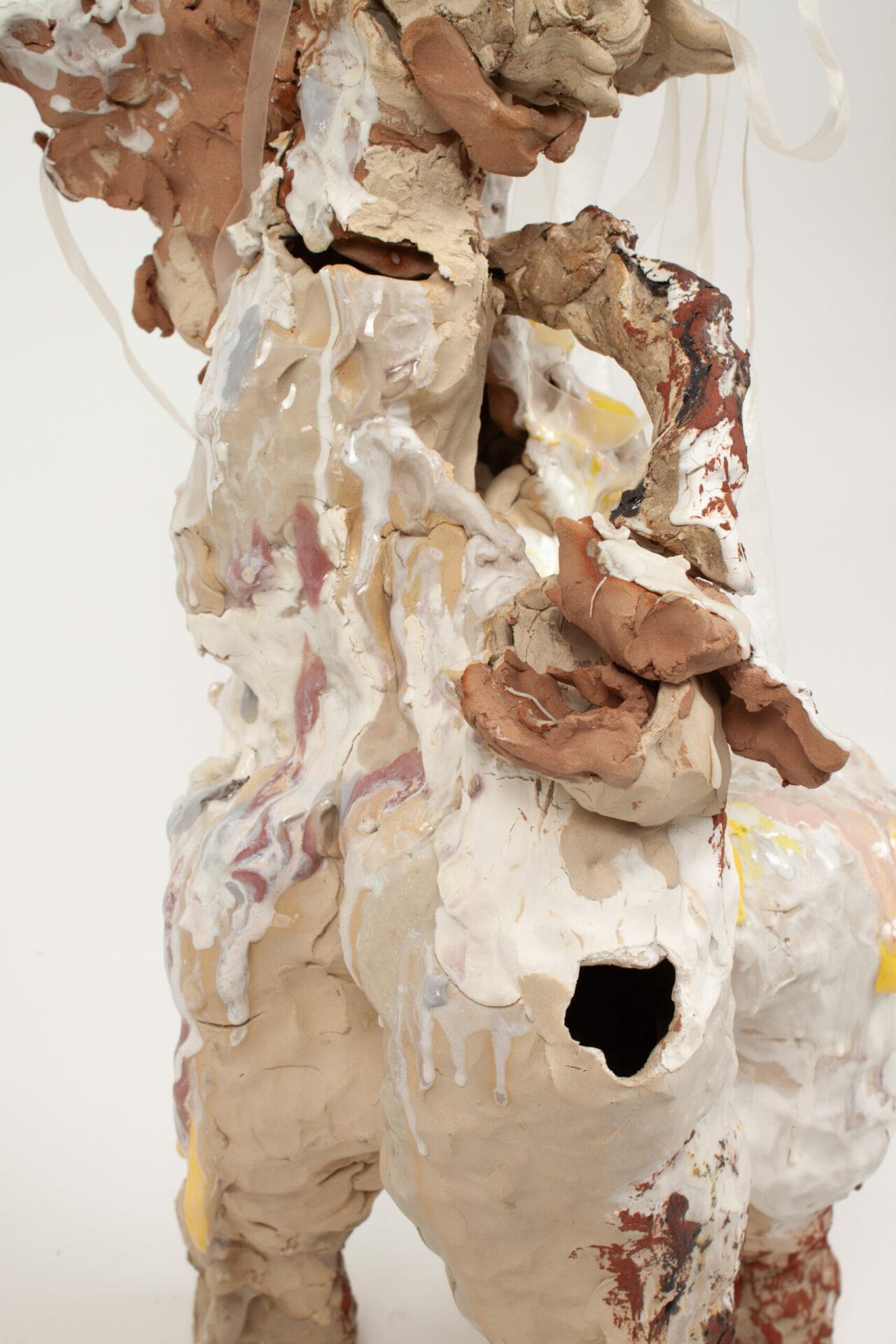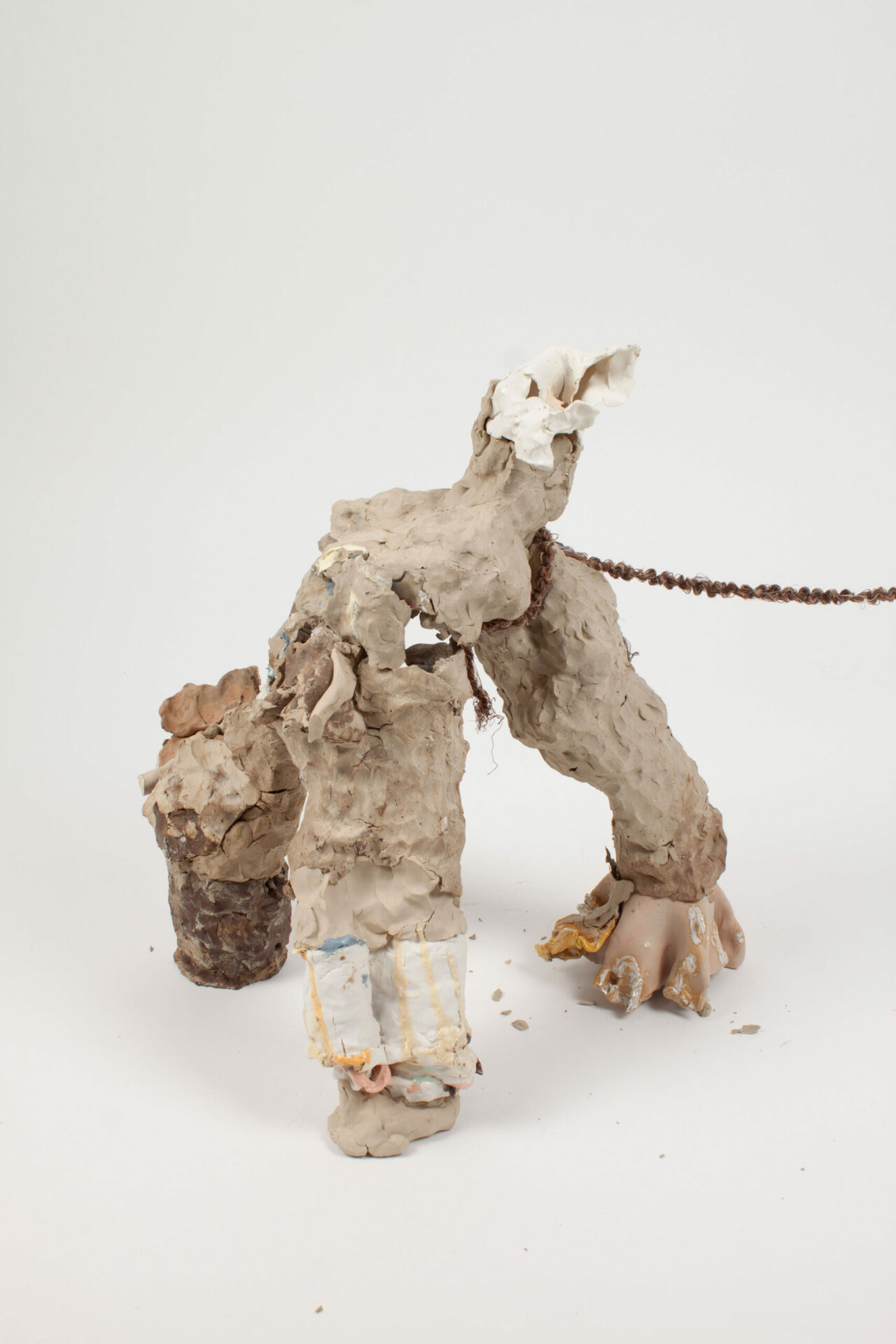 I build animalistic structures that are generally meant to, at some point, be broken, shed, have elements knocked off of them. Often when substantial breaking occurs, I reorientate them in the kiln, add to the sides, stick them together, and give them new ways to continue breaking down. Letting my work live instead of putting it away on a shelf is important to me.
