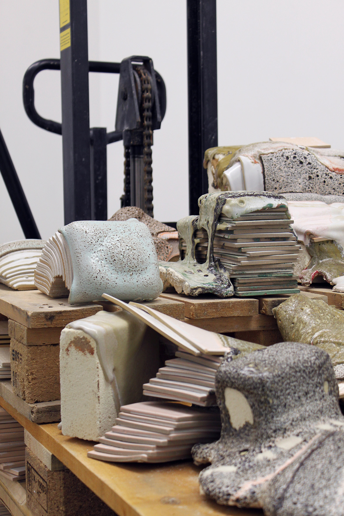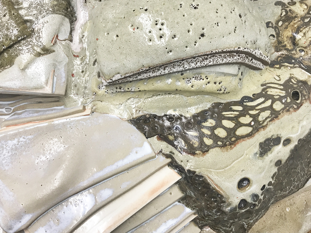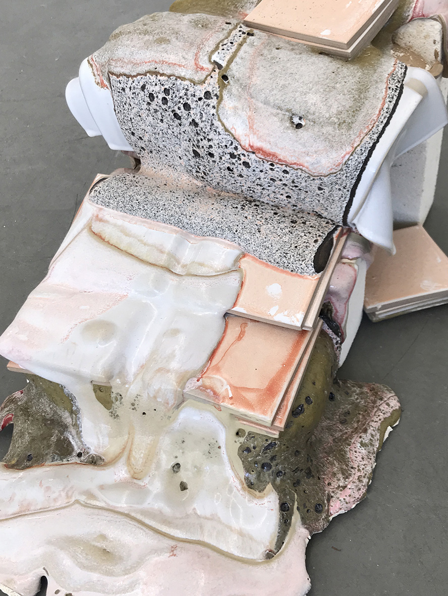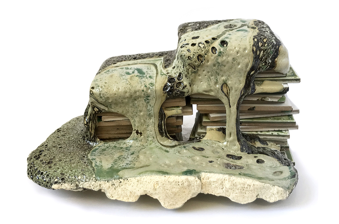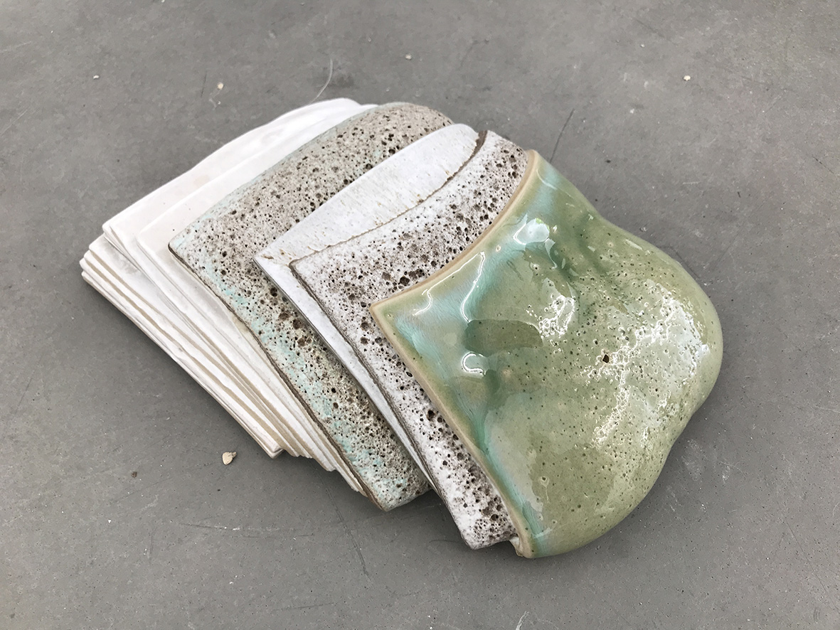 Once part of a mountain that was weathered down and ran with rain to find rivers and become clay. The raw material for this project was collected from a waste recycling station, rejected as leftover materials. Ceramic tiles, re-fired, reveal that the squares that seemed fixed are still malleable. In the heat of the kiln, transformations take place, folding, running, bubbling.